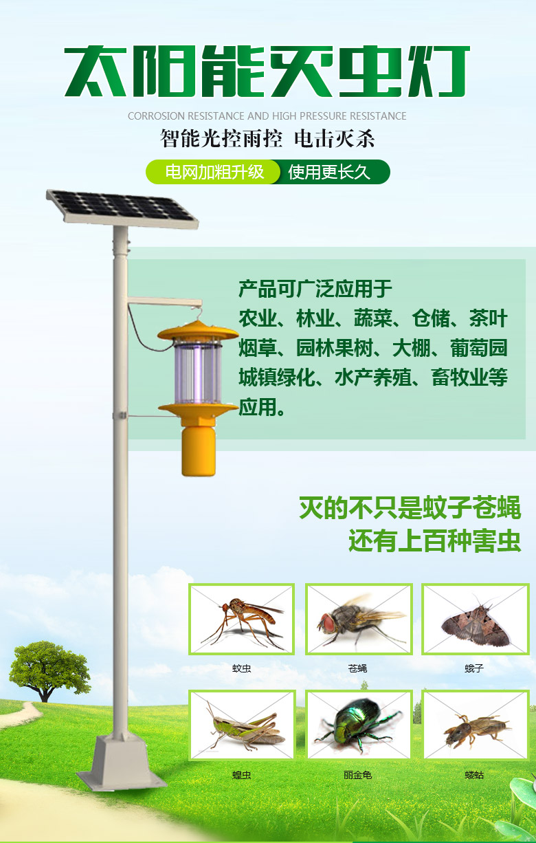 频振式杀虫灯等工具的应用能保绿色蔬菜健康生长吗?我们都知道,蔬菜生长中是容易遭致害虫的,且不同害虫带来的影响也不同,为了降低害虫对蔬菜产量的影响,蔬菜种植户是需要对蔬菜病虫害进行有效防治的。但在杀虫灯出现前,种植户防治蔬菜病虫害主要依靠农药化肥,然而农药化肥长年累月的增加使用,给农产品带来了很大弊端。农药杀虫的原理是通过有毒的化学药剂来杀死害虫,这些药剂在杀死害虫,也会对农作物的土壤、环境和农作物影响,一旦农药残留在农产品或土壤中,那么农产品和土壤品质机会受影响,蔬菜也就不“绿”了。