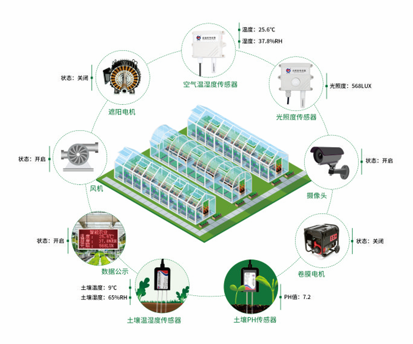 温室大棚智能控制系统概述温室大棚智能控制系统是智能化管理大棚的科学系统,这种系统需要相应的感应设备来保证系统的正常运行,智能控制系统是将信息技术运用到农业的体现,通过系统设定的各种指令,自动化的完成管理工作,无需大量的人工操作,是一种现代化农业发展的必要工具。温室大棚智能控制系统组成温室大棚智能控制系统主要由温室环境信息采集传输、温室设备智能控制基本的环境因子,如温度、湿度、光照、土、云平台三部分组成,本系统可以通过监测壤温湿度、CO2浓度等,并利用手动、自动控制各种设备( 卷帘卷膜、加热器、湿帘、水泵及风机等 ),以适应不同生物生长繁育的需要。温室大棚智能控制系统架构图   温室大棚智能控制系统产品特点1、精确掌握环境指标,取代“凭感觉”;2、随时随地掌握现场信息,随时随地控制现场设备;3、提升率降低劳动强度;4、自动调节各项指标,为作物提供“舒适”、稳定的生长环境;5、形成标准化种植,方便管理。温室大棚智能控制系统软件及控制功能1、用户登陆  规定用户使用权限,非用户不能登陆系统。可设置权限对用户和密码进行修改。分两级权限:温室察看权限、参数修改权限。2、系统监控  监控室内外温度、湿度、光照度、土壤水分、土壤温度、二氧化碳、风速、雨雪等设备的动作和状态;当温室内出现异常时进行声音、图像报警。3、控制功能  可通过计算机屏幕实现控制设备的自动及手动转换;  自动:能根据用户设定的参数(温度、时间)对天窗、外遮阳、风机、水泵进行保温、降温控制。当打开湿帘和风机时系统会关闭天窗。  手动:通过鼠标操作实现控制设备的开启、关闭和启停,实现远程强制手动控制操作。4、参数设定及浏览 对所要实现自动控制的参数(温湿度、光照度等)进行设定,以满足自动控制要求。5、实时曲线  实时趋势曲线可将系统采集到的温室内的数据以实时曲线的方式显示出来,以便于观察系统检测状态。6、历史曲线  可显示出温室内各测量参数的日、月、季、年参数变化曲线,根据该曲线可合理的设置系统参数值,以及分析各参数变化对作物生长的影响。7、报表 可将温室内数据测量结果送入至软件的报表服务器中,以报表形式对各参数进行分析和浏览。
